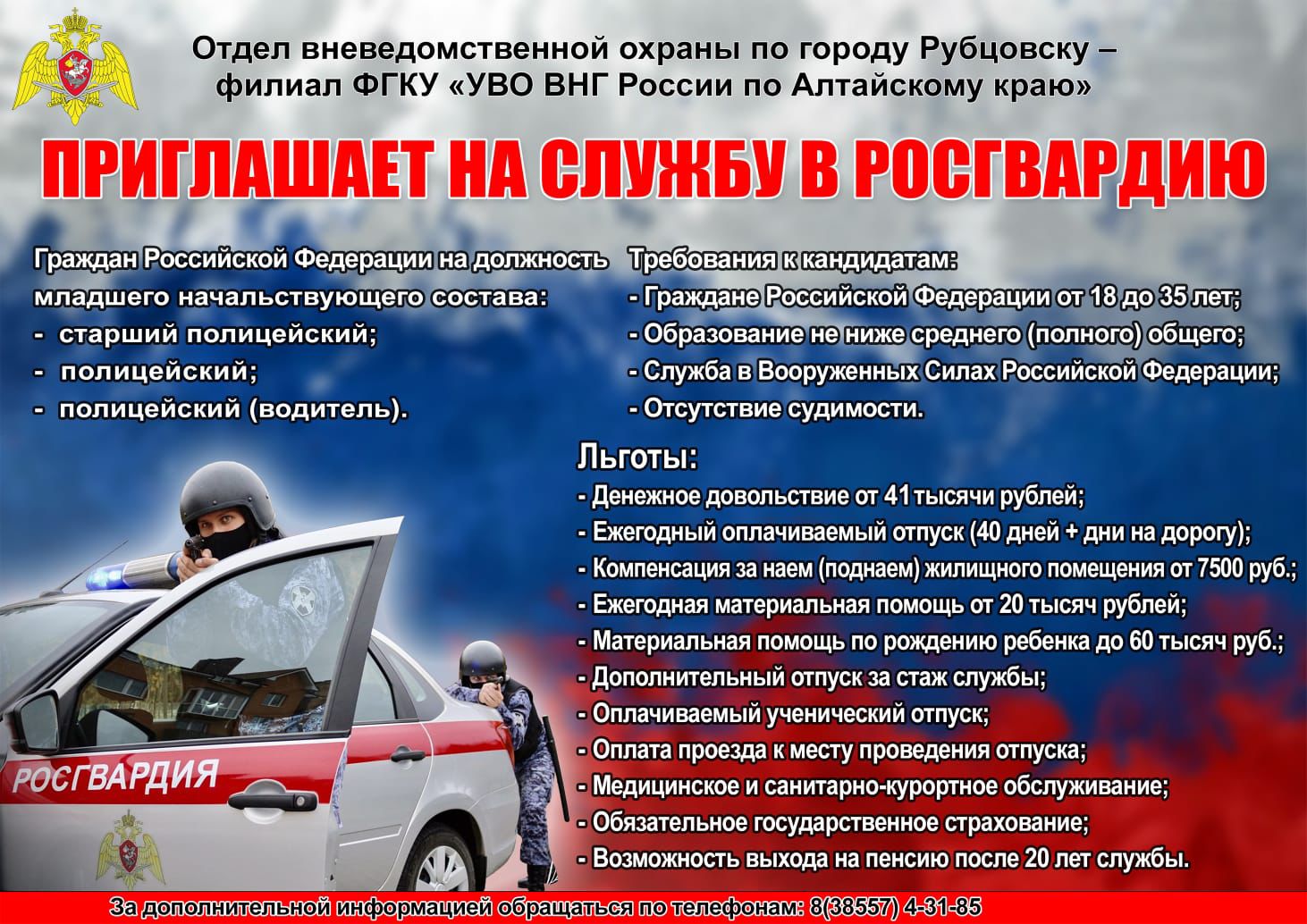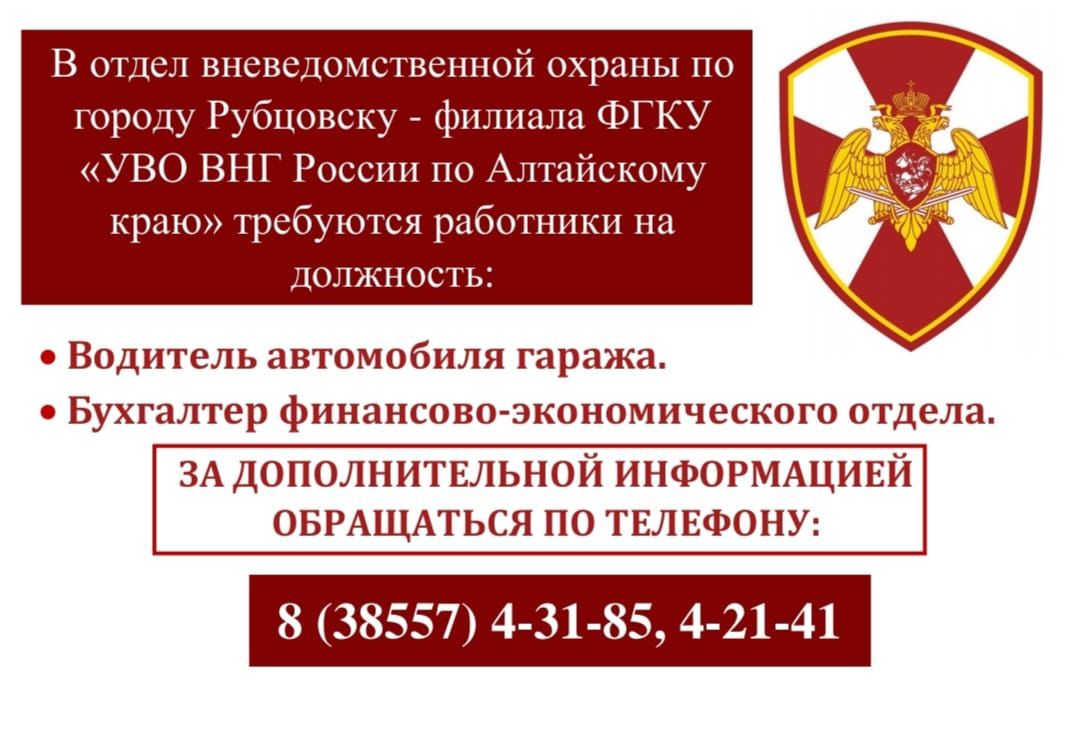 Отдел вневедомственной охраны по городу Рубцовску - филиал ФГКУ «УВО ВНГ России по Алтайскому краю приглашает на службу в Росгвардию