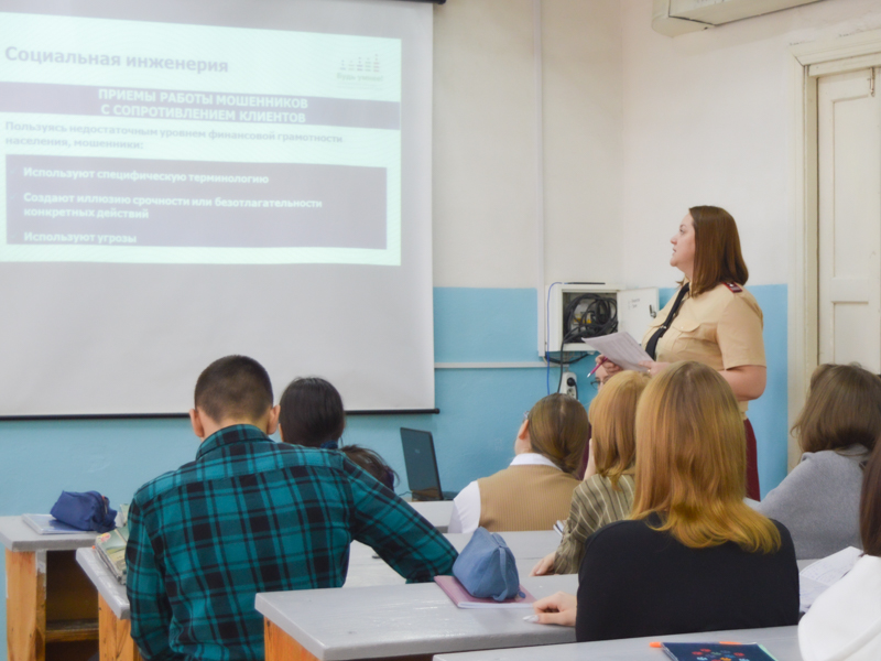 В ходе диалога Наталья Вячеславовна разобрала со студентами самые распространённые сегодня схемы финансового обмана: методы социальной инженерии, механизмы дропперства, уловки кредитных мошенников и риски микрофинансовых организаций. Акцент в обсуждении был сделан на практику: как действовать при подозрительном звонке, как безопасно использовать банковские карты и цифровые платформы.